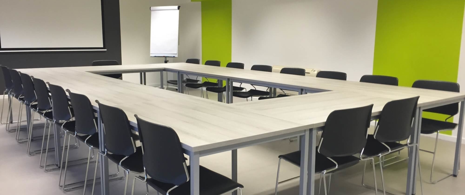 Flipchart, Pinnwand, Fernseher oder Beamer-Leinwand ergänzen das Bild.